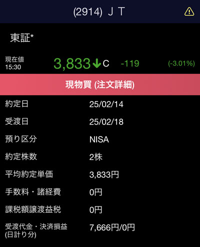 これで日本たばこ産業(JT)はNISA口座では6株の保有となり平均取得単価は3,923です。
