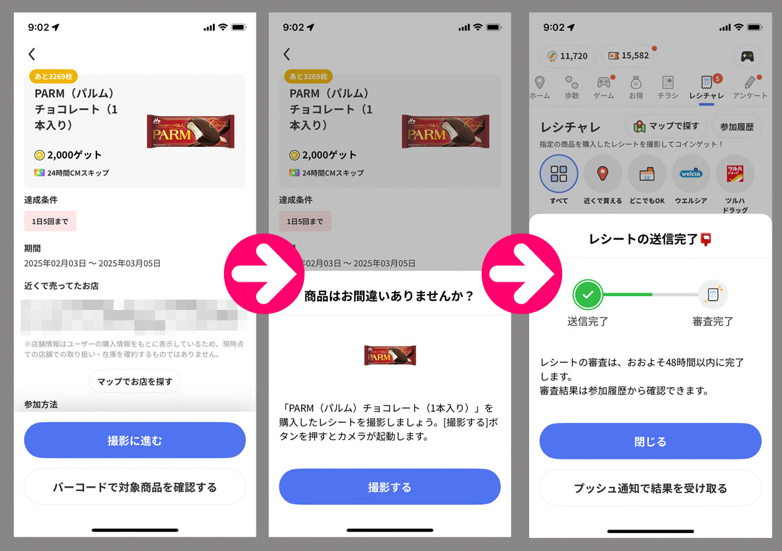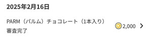 クラシルリワードのレシチャレ55 連日のレシチャレw 今日も早朝のジョギング(足を痛めました⤵)の帰りに お題も「PARM(パルム)チョコレート)」森永乳業 です。ついに終了までのカウントダウン3269(数量記載)が始まりました。 今回は前々回に買ったローソンなので当然一番乗りではありまん。 一番乗りでもメリット無し・・・と書きましたがチケットが3枚付与されるみたいです。 今日はもう審査完了しました。 1時間ぐらい??? 折角なので今回はシルバー会員にグレードアップさせるつもりです。