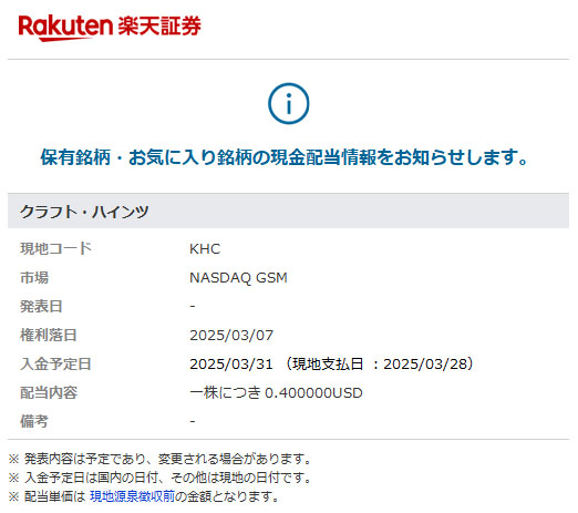 クラフト・ハインツ(KHC)配当予告 2025.3 クラフト・ハインツ(KHC)の配当予定の案内が楽天証券から届きました。 クラフトハインツは少しだけ増えて現在5株の保有。 $0.4×5株=$2.0 $2.0×0.9=$1.80 $1.80×0.8=$1.44・・・ぐらいだと思います。