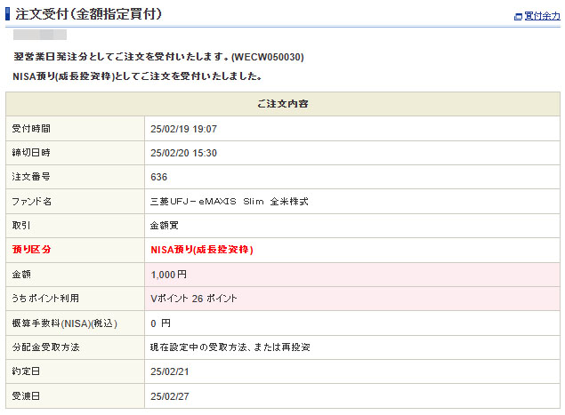 Vポイントが入ったのでeMAXIS Slim 全米株式を1,000円分追加|2025.2.19 52ポイント入った半分の26ポイントは「eMAXIS Slim 全米株式」へ入れます。 こちらはNISA口座でやはり26ポイント利用で現金は口座から974円の出金。 約定は金曜日の2月21日です。 今回はauレバナスのヘッジなしにも入れたかったのですがもう資金が・・・⤵⤵⤵ 来月は納税もあるし。。。