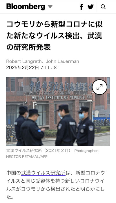 Bloomberg(コウモリから新型コロナに似た新たなウイルス検出、武漢の研究所発表 2025.2.23より 引用)