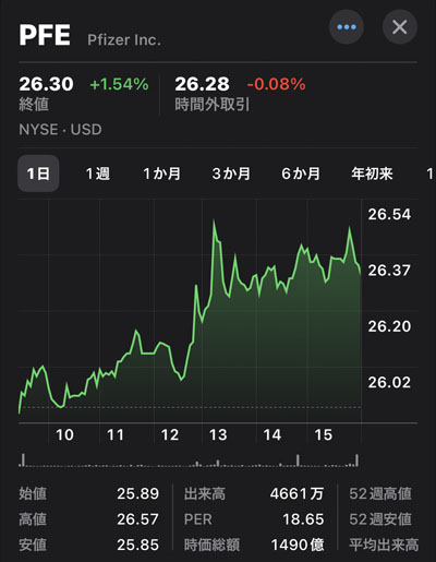 これにより米国のワクチン関連が上昇したとのことで私の持ち株のファイザーも上がりました。