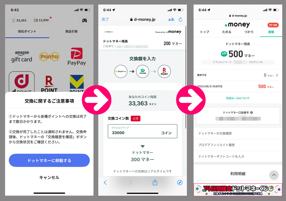 クラシルリワードのコインが貯まったのでドットマネーに変換|2025.2.23 まぁこれだけレシチャレやってればコインは貯まりますわw 5日で33,000に達しました。(詳しい変換方法と換金方法はこちらをご覧ください) 残が200マネーあったので今回で500ドットマネーです。あと2周には違いありませんが0からの4周とは労力がかなり違います。
