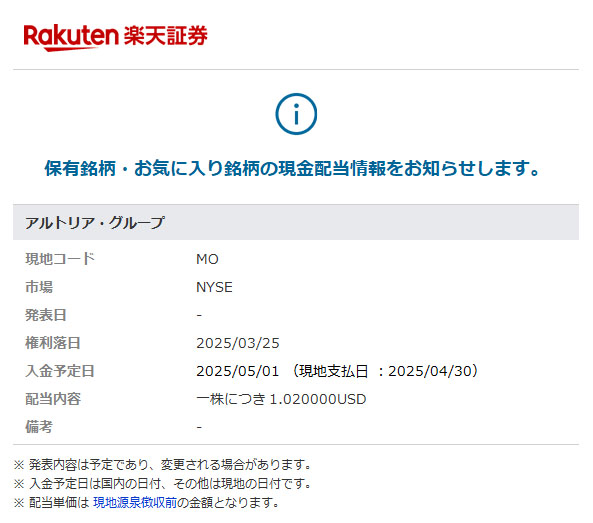 アルトリア・グループ(MO)配当予告 2025.4月分 5月分のアルトリア・グループの配当予告メールが楽天から届きました。 現地では4月配当ですが日本で反映されるのは5月です。 前回同様$1.02なので・・・ $1.02×4株=$4.08 $4.08×0.9=$3.672 $3.672×0.79685≒$2.926 $2.94だと思われます(コピペ) 実はMOは現在指値で買い注文をしていますがこのところ上げており全く刺さりません。一応、3月末まで粘りますが無理っぽいです。