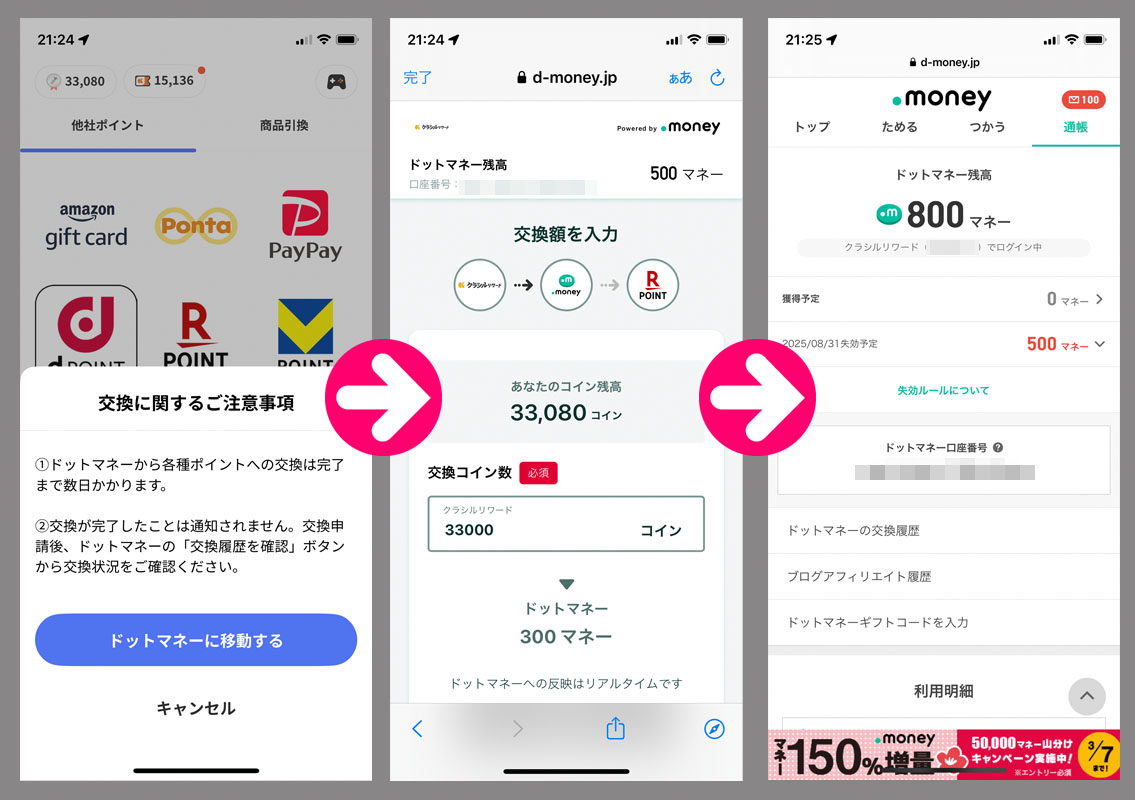 クラシルリワードのコインが貯まったのでドットマネーに変換|2025.3.3