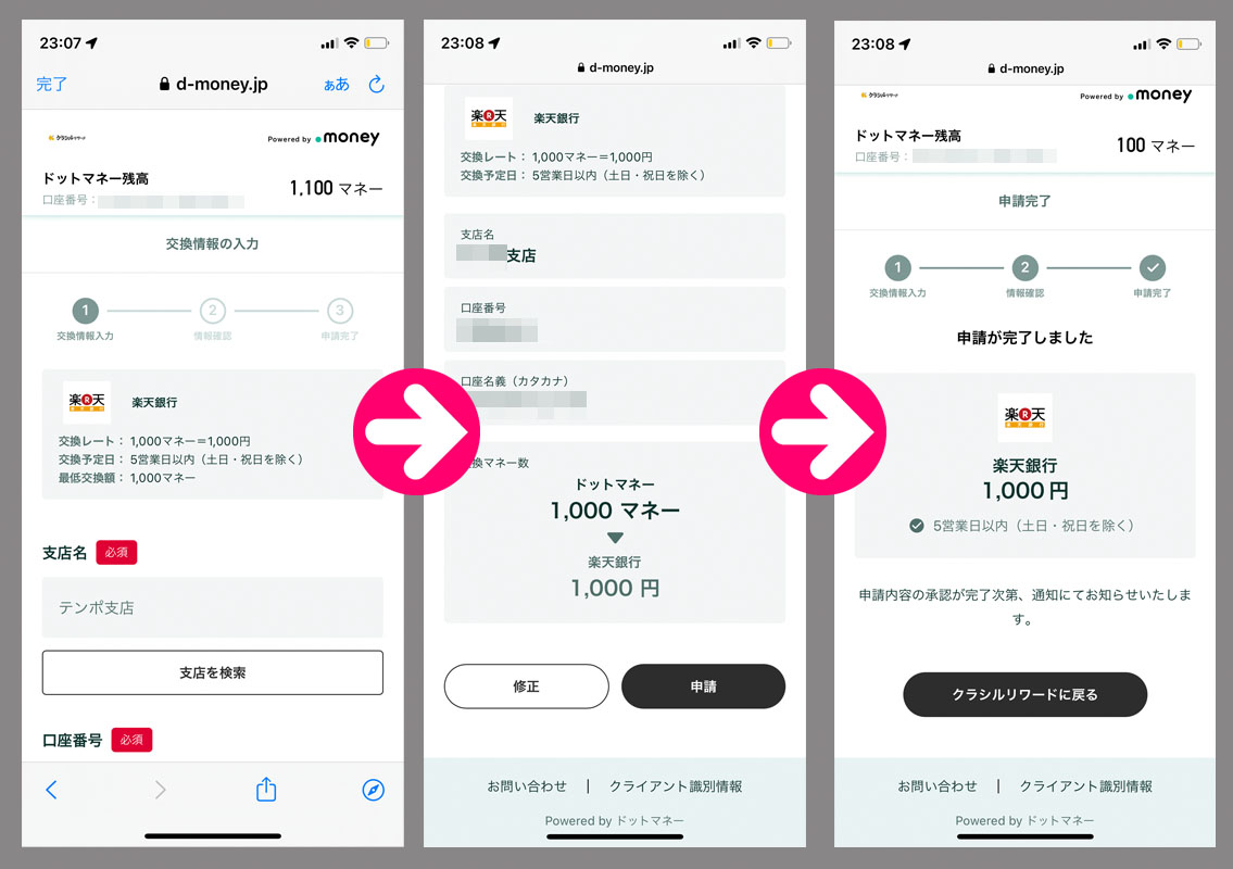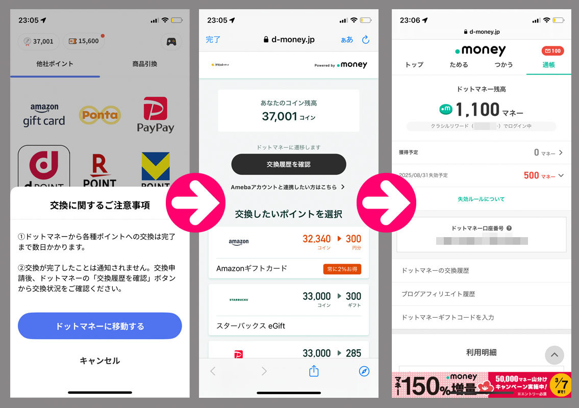 クラシルリワードのコインが貯まったのでドットマネーに変換からの換金手続き|2025.3.7 このところレシチャレづいてきて約3週間で換金になりました。 今は3周なのでレシチャレ併用すれば早いです。 (詳しい変換方法と換金方法はこちらをご覧ください) ここまでがクラシルリワードのアプリ上での操作 ここからは.maney(WEBサイト)での操作です。 今、米国はトランプ相場で全体にバリュー、グロース問わず関税によるインフレからの景気後退懸念で株価は大幅に下がっています。個人的には買い場だと思っていますのでw