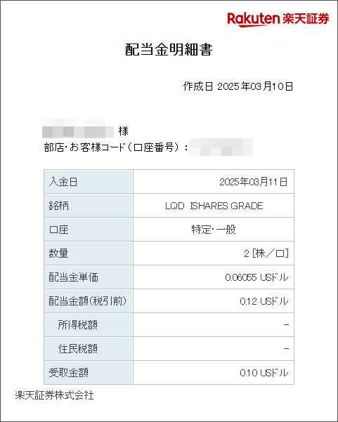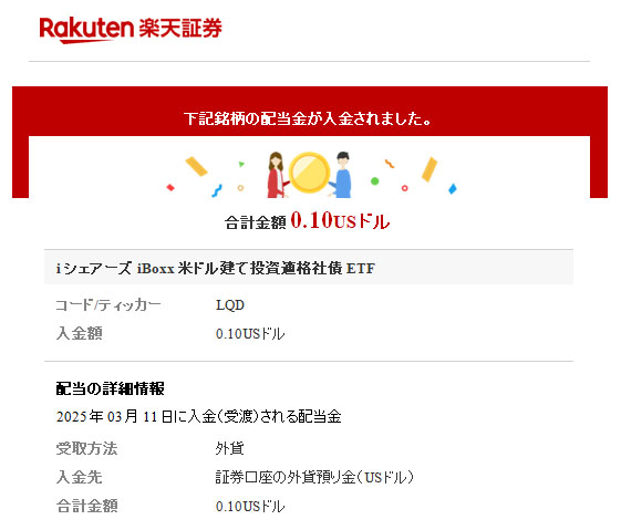 LQD(iシェアーズ iBoxx 米ドル建て投資適格社債ETF)から分配金が入りました|2025.3.10 今月も2回目のLQDの分配金の入金です。 楽天証券からのメールで気付きました。 LQDって2回入るの?楽天証券だけ??? 知らないってのは恐ろしいですねw 0.35149+0.06055=$0.41204(税込) blackrockのWEBサイトで確認すると 少し誤差がありますが多分こういう事。 ですので何故か2回に分けて入ってるようです。まだ始めたばかりなので良くわかっていませんので予後確認ですね。ほかの証券会社の同様なのかな?
