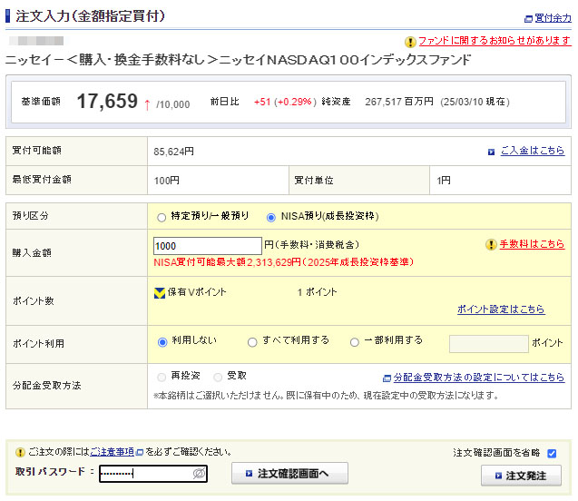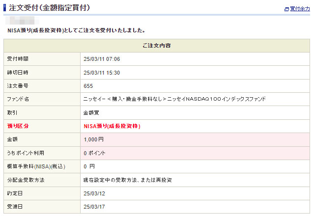 歩いて稼いだ資金を「ニッセイNASDAQ100インデックスファンド」へ|2025.3.11 申請していたクラシルリワードのコイン分のドットマネーが現金化しましたので「ニッセイNASDAQ100インデックスファンド」に1,000円分入れました。 CYBERAGENTから楽天銀行口座に1,000円の入金。 入ってきた1,000円分をそのまま・・・です。 昨年から「ニッセイNASDAQ100インデックスファンド」はNISAの成長投資枠で運用しています。 約定は明日(12日)です。 昨晩、NASDAQが4%も下げていたので急いで買いましたw 米国はしばらくこんな感じのボラの大きい下げ相場になるのでは?と思っています。今が買い時です笑