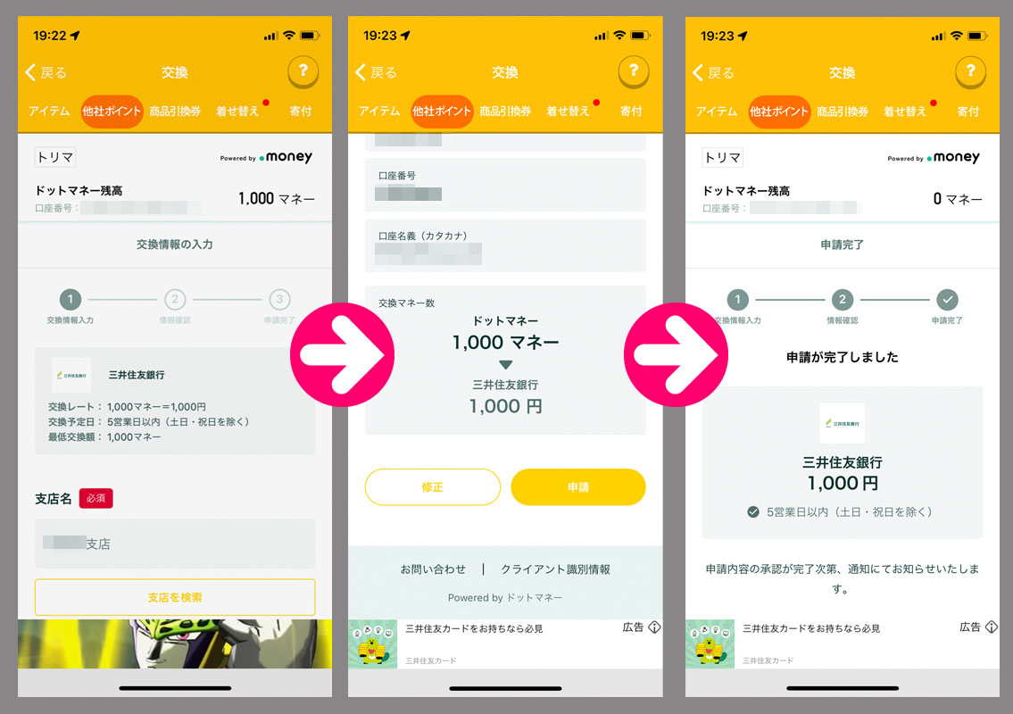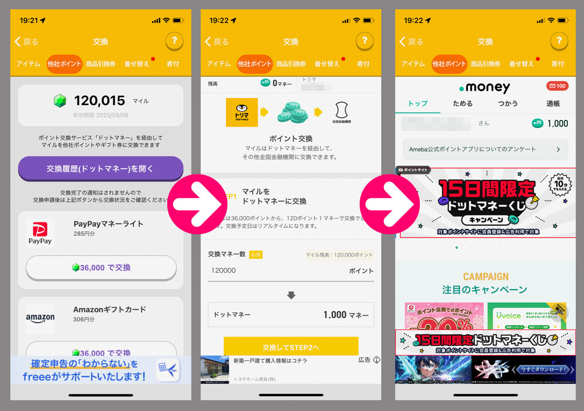 トリマで貯めたマイルをドットマネーに変換からの換金へ|2025.3.12 前回から丁度1ヶ月で120,000マイルになりドットマネーに変換からの銀振申請をしました。 (詳しい換金手順はこちらをご覧ください) 今回はスロットに頼らずに達成! トリマは三井住友銀行に紐づけています。 今日は3月12日(水曜日)ですがもう20:00近いので振り込まれるのは来週の月曜日かな? トリマなので「iFreeレバレッジFANG+」へ入れる予定です。 ==================== 3月18日 予想より1日遅れで入金がありました。