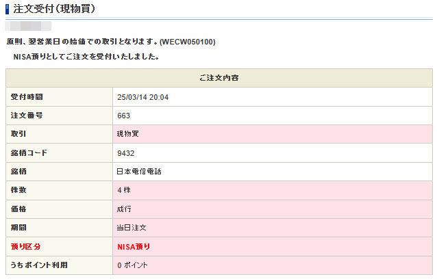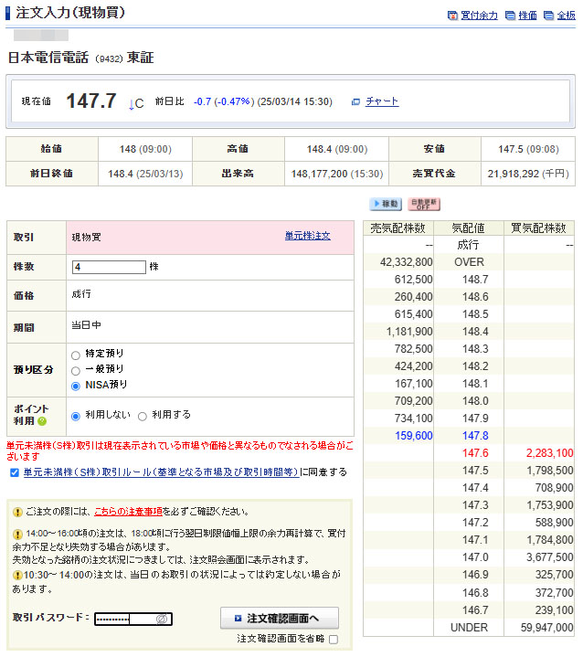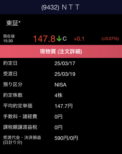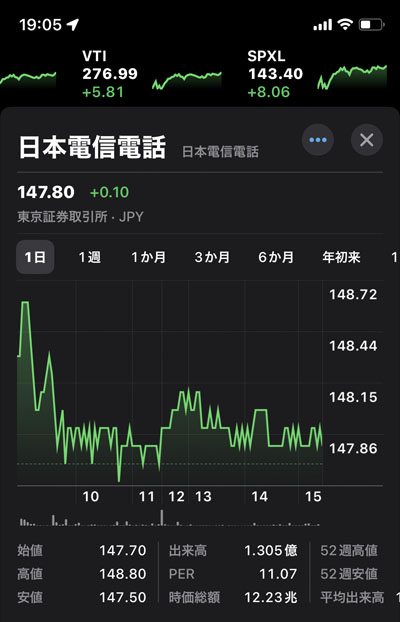 Vポイント投資の買付後、口座を見ると小銭w があったので下げ止まらず上値の重い日本電信電話(NTT)をその小銭で買えるだけ買うことにしました。NTTは今月末が配当権利落ちなので下げてますし・・・。