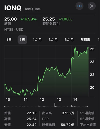 イオンキュー(IONQ)|2025年3月第3週|$25.00 今週は久しぶりに騰げて終わりました。 特に昨晩(金曜日)に大きく上昇。米国下落トレンド中の反発で地合いも良かったが他の量子銘柄も連れ高でした。 別段何かIONQに好材料があった訳ではなさそうなので一時的な反発騰げかも?でもこのまま下げっぱなしではない様で少し安心ですね。ただ騰げれば売り圧力が出そうなので来週が見ものです。