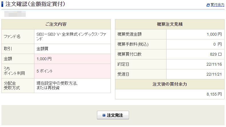 僅か5ポイントですがまたVポイントが入った(入っていた)ので手元資金995円をプラスして1,000円分スポットで追加投資しました。