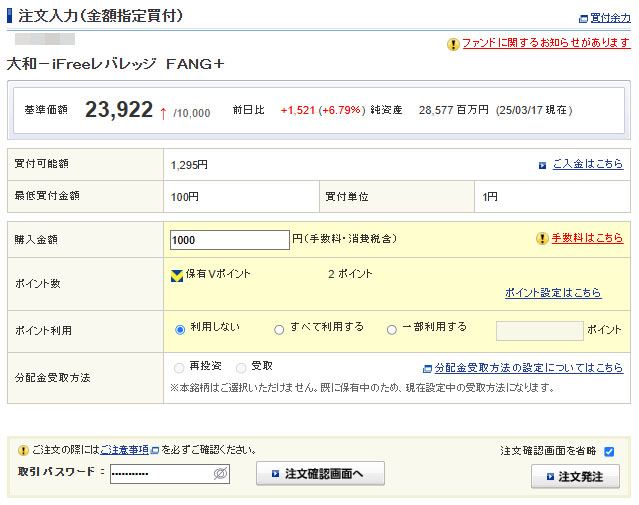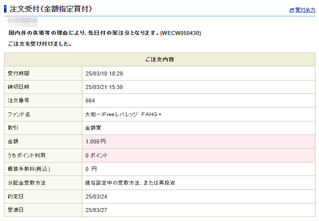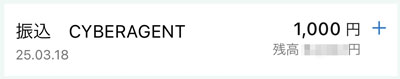 歩いて稼いだ資金を「iFreeレバレッジFANG+」へ|2025.3.18 申請していた「トリマ」分のドットマネーが現金化されましたので「iFreeレバレッジFANG+」へ1,000円をそのまま入金します。 今日未明・・・CYBERAGENTからの入金。 そのまま1,000円。レバなので特定口座です。 約定は24日・・・来週か。。。祝日が挟むからか? ん~~~折角の下落(ここ2日はリバってますが)相場なのに・・・イイから下がれwww