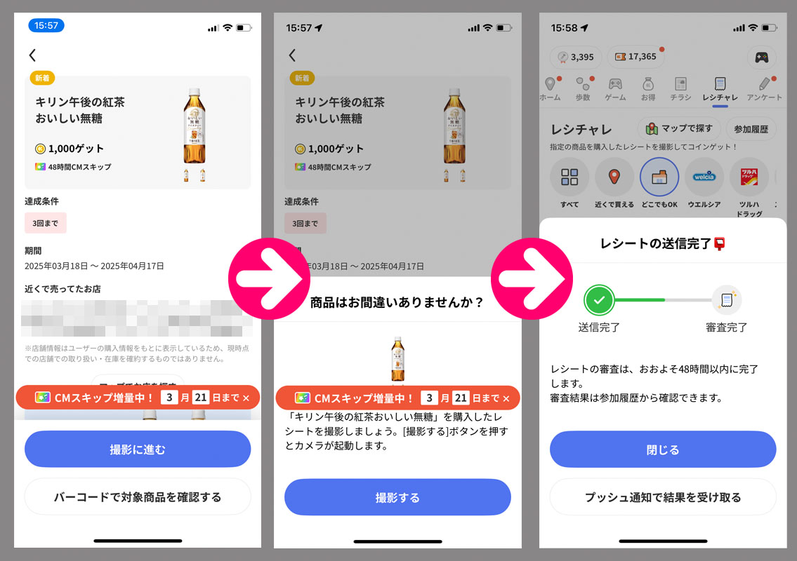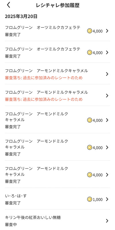 技術が進み?ほぼリアルタイムで審査がされるようになりました。ただ1つのレシートに多くの商品が掲載されてる(レシチャレ対象商品以外)と時間が掛かるようです。