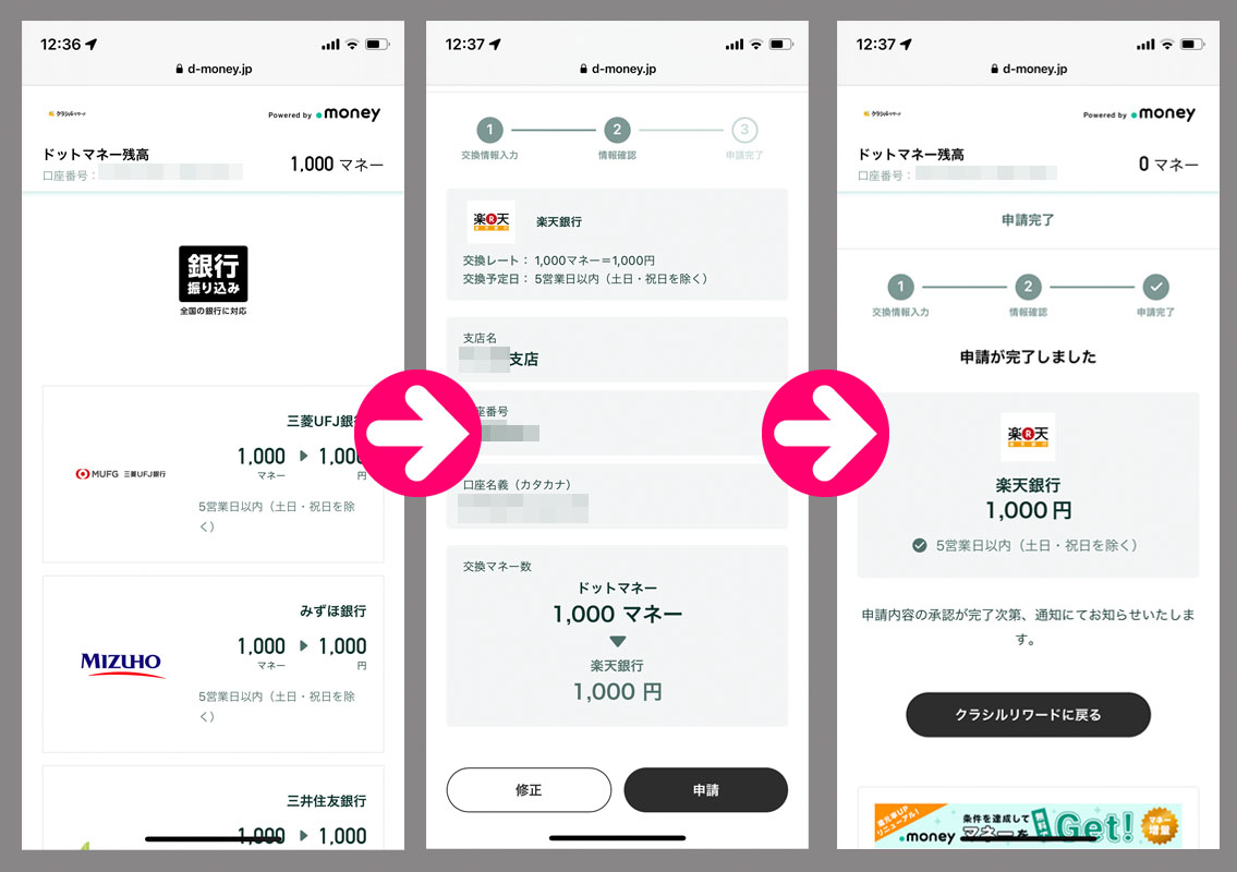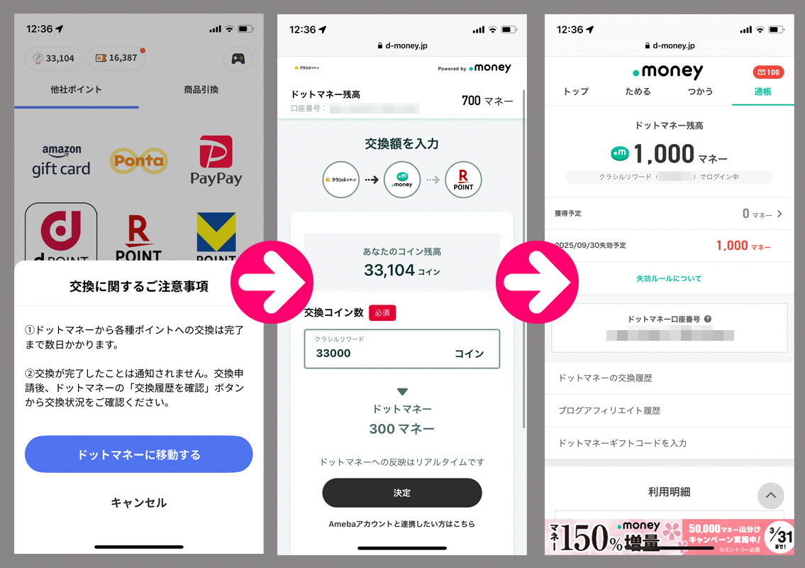 クラシルリワードのコインが貯まったのでドットマネーに変換からの換金手続き|2025.3.21 レシチャレで21,000コインを得たので33,000に達しました・・・ので今回で3周目終了で換金手続きまで。 今回の300ドットマネーで1,000になりました。(詳しい変換方法と換金方法はこちらをご覧ください) クラシルリワードは楽天銀行口座に紐づけています。 レシチャレしまくって2週間で換金です。「フロムグリーンシリーズ」はCP良いしアイスも美味しいし178円とカップアイスにしては割高だけどトータルではお得。クレカ支払いのポイントにもなるし。