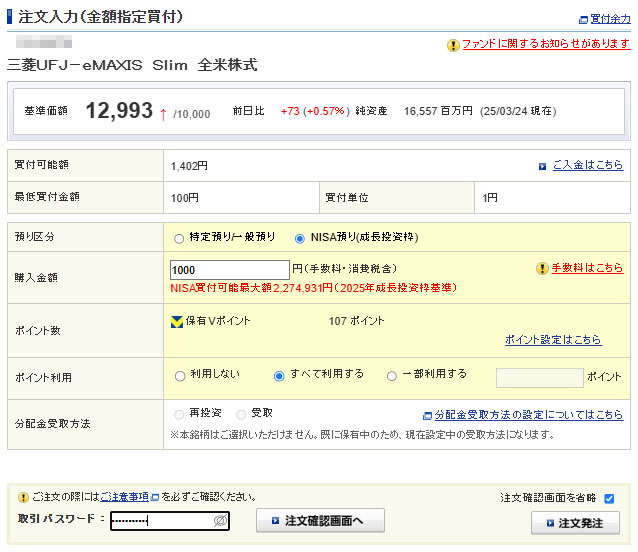 Vポイントが入ったのでeMAXIS Slim 全米株式を1,000円分追加|2025.3.26 残りのポイントは「eMAXIS Slim 全米株式」へ使い、やはり合計で1,000円分の入金をします。 こちらはNISAの成長投資枠で運用しています。107ポイント利用で893円の口座からの現金の持ち出しとなります。 約定は3月27日(木曜日)です。 このVポイントでの「eMAXIS Slim 全米株式」への投資は今月までとし、当面は放置の予定です。