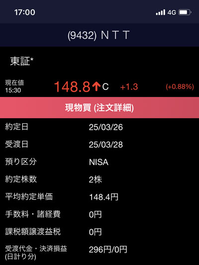 また口座に少し残高があるので日本電信電話を2株追加することにしました。