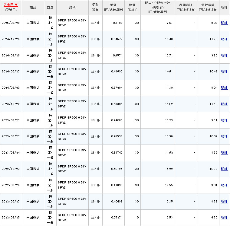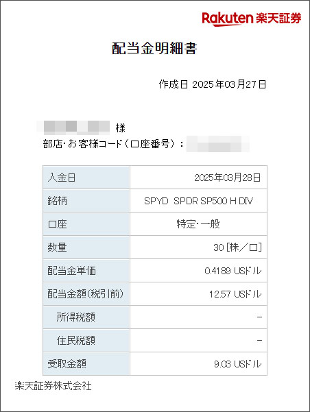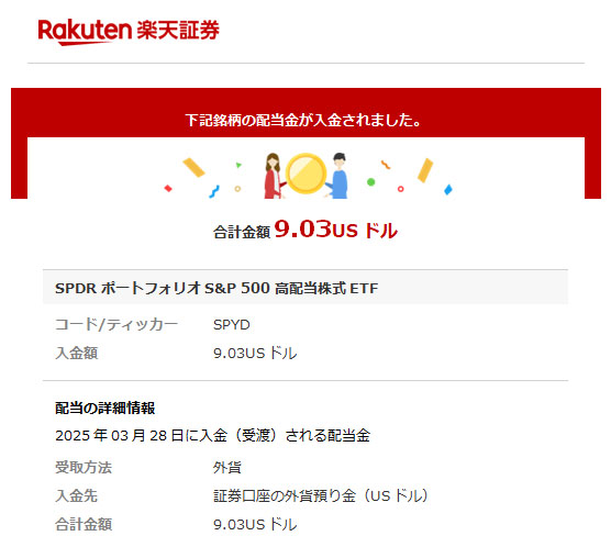 SPYDの配当がでました|2025.3.27 米国の高配当ETFのSPYDから配当が入りました。 SPYDは年4回の配当なので嬉しいです。まぁ毎月のLQDを始めたのでやや有難味が薄れましたがw 今回は・・・ 30株×$0.4189=$12.567 $12.567×0.9=$11.3103 $11.3103×0.8≒$9.03 でした。 前回より減りましたが前年同期よりは増配なのでまぁ良しと・・・。 楽天証券からのメール。