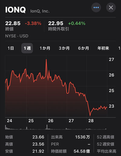 イオンキュー(IONQ)|2025年3月第5週|$22.85 今週の前半はイイ感じでしたが昨晩大きく下げて結局は先週末とほぼ変わらず。 個人的にも関心がなくなりつつありますw が週末のチェックは続けます。 この10株はとりあえずキープです。$10を割るようなことがあれば追加してもイイいかな~とかw なんだかんだでまだトリプルバガーです。