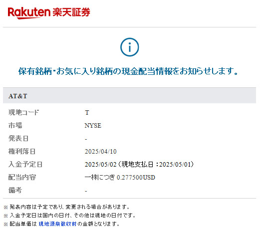 AT&T(T)配当予告 2025.5月分 楽天証券から「AT&T」の配当予告メールが届きました。 AT&Tは22株の保有 ========(以下、コピペw)======== 配当は$0.2775と前回、前々回、前前々回、前前前々回と同じ $0.2775×22株=$6.105 $6.105×0.9=$5.4945 $5.4945×0.79685=$4.37829・・・で、前回は$4.39でした。 ===========================