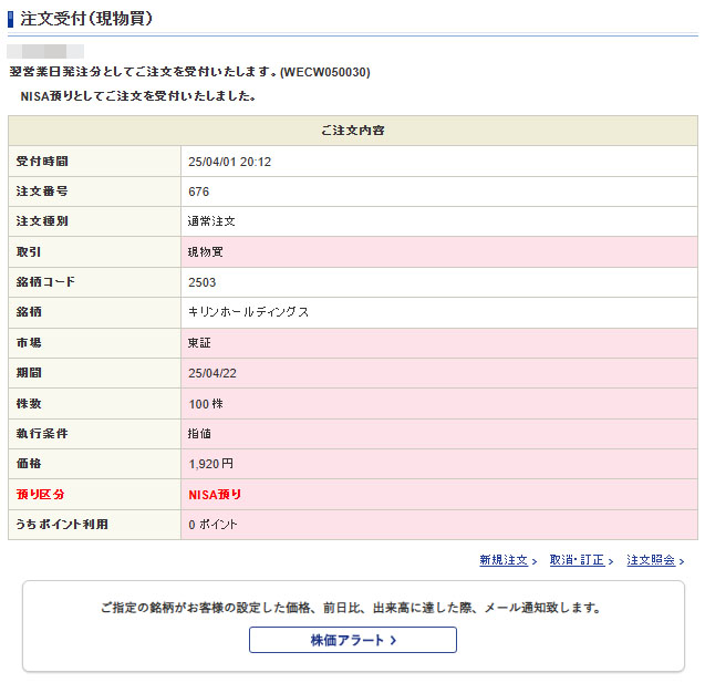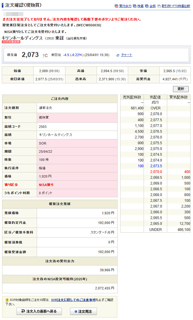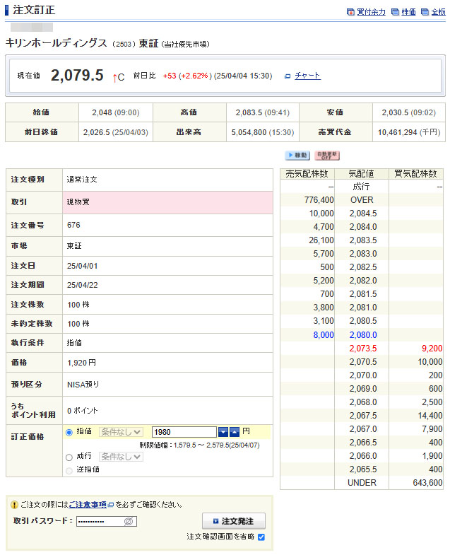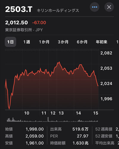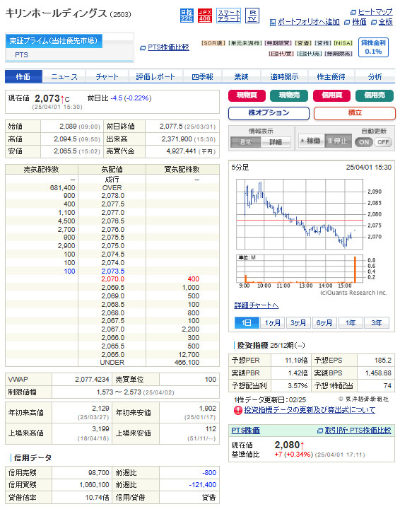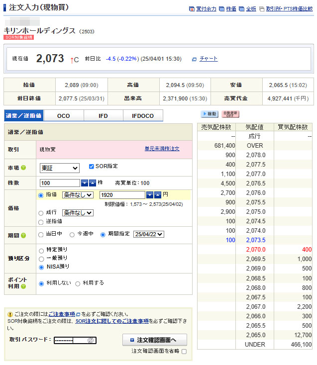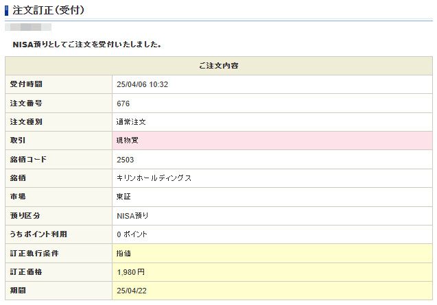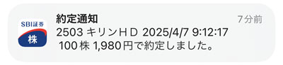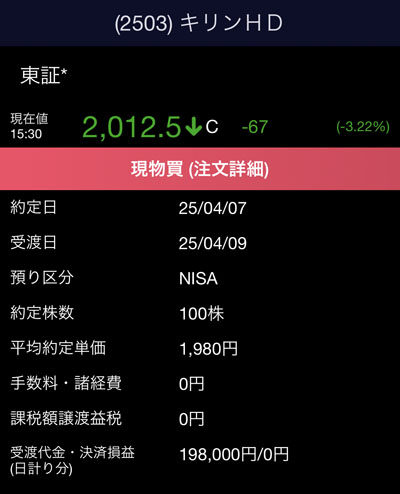 キリンホールディングス(2503)を100株買い注文|2025.4.1