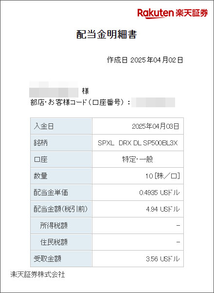 SPXLの分配金が入りました|2025.4.2 米国S&P500指数3倍ブルETFの「SPXL」から分配金が入りました。 今回は$0.4935 前回(1月)が$0.3207 前年同月が$0.39478 でしたので結構上がりました。 税金は2種課税で手残りは$3.56 SPXLは当然キャピタル狙いなので分配金はさほど気にはしていませんが、10株で年4回$3.56なら結構イイですよね