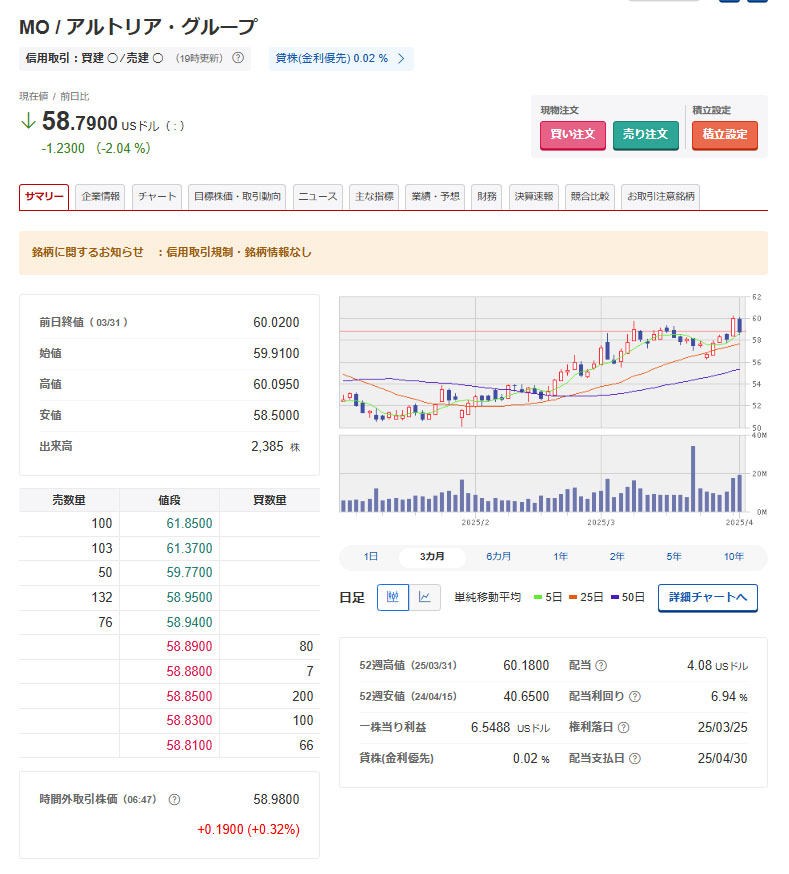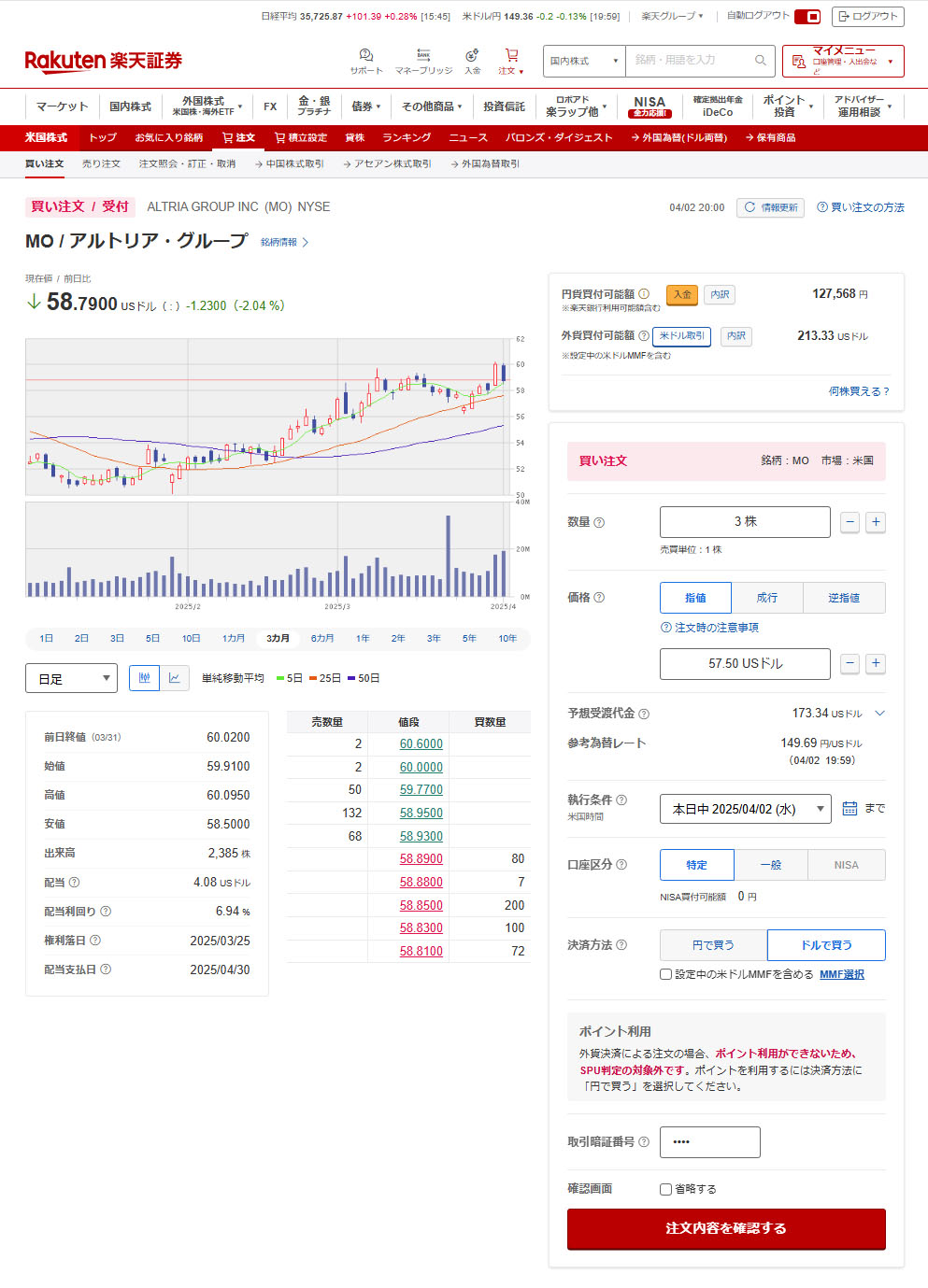 今年2月に「IONQ」を売って得た$で「アルトリア・グループ(MO)」を6株分指値で注文していたのですが株価が騰がり続け全く刺さらず1ヶ月が経ち期限切れ。口座に$で持ってても仕方ないので指値を上げて今度は3株で注文し直しました。今日、トランプの相互関税の発表があるので大きく下がればと思いましたが・・・。