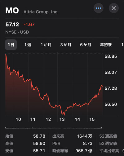 何と今日は「アルトリア・グループ」は下げ相場で珍しく大きく下げました。