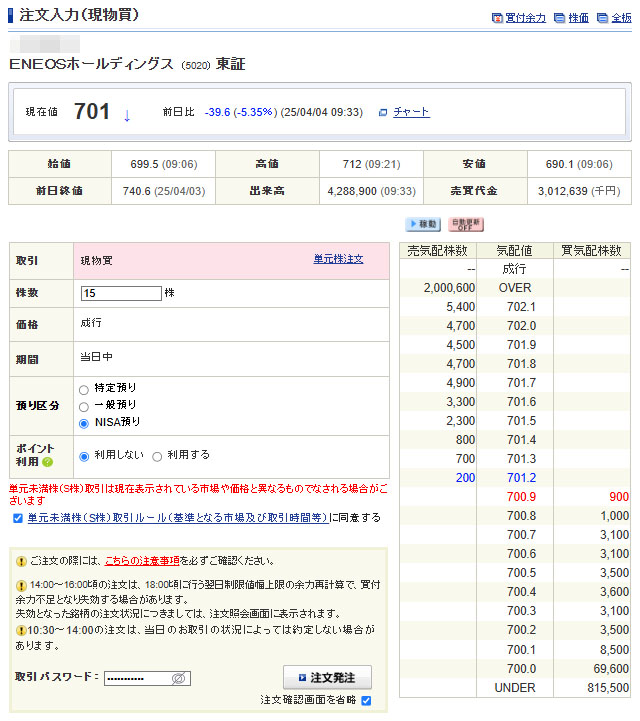 NISA口座(成長投資枠)で単元未満15株の発注!SBI証券なので自動的に成行です。