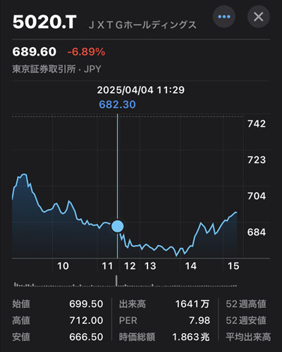「三菱UFJフィナンシャルグループ」に続いて私の『高配当株15銘柄」では保留中となっていますが昨晩のNYの下落、WTIの原油先物安、円高が重なって「ENEOS」もかなり下げているので思い切って15株買って単元にしようと思います。