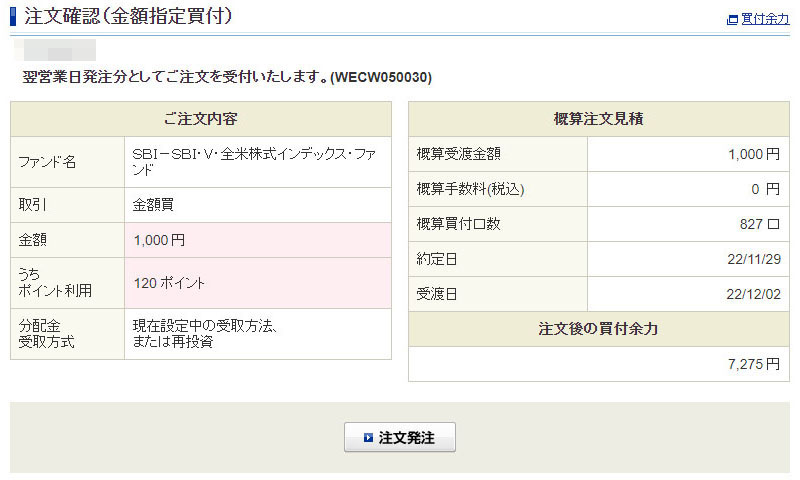 正直、どのタイミングでVポイントが入るのか把握していませんがまた120ポイント溜まったので「SBI・V・全米株式インデックスファンド」に1000円分追加投資です。