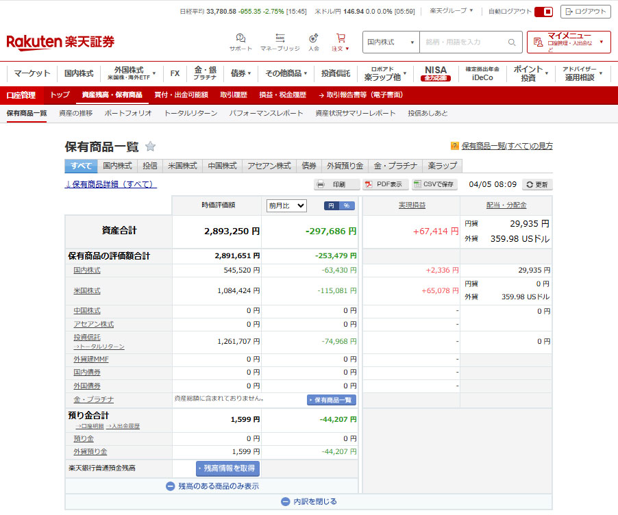 楽天口座は米国株式がメインなのでかなり資産が目減り。。。