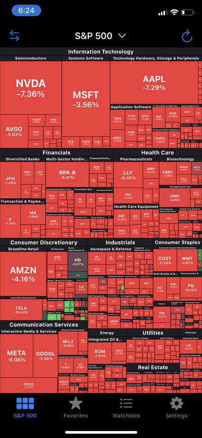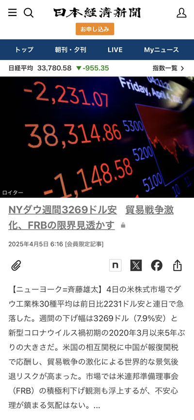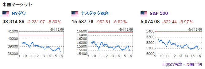 ブラックフライデーか? 4月4日のNY市場は大幅に下落・・・もう暴落といえるのでは? S&P500は御覧の通り 3指数も5%以上下落 全面安です。 週間でダウはコロナ以来の下落だそうで最早暴落でしょう。 関税ショックではなく「トランプショック」と名付けて欲しい 本人も歴史に名が遺せて満足な事でしょう。