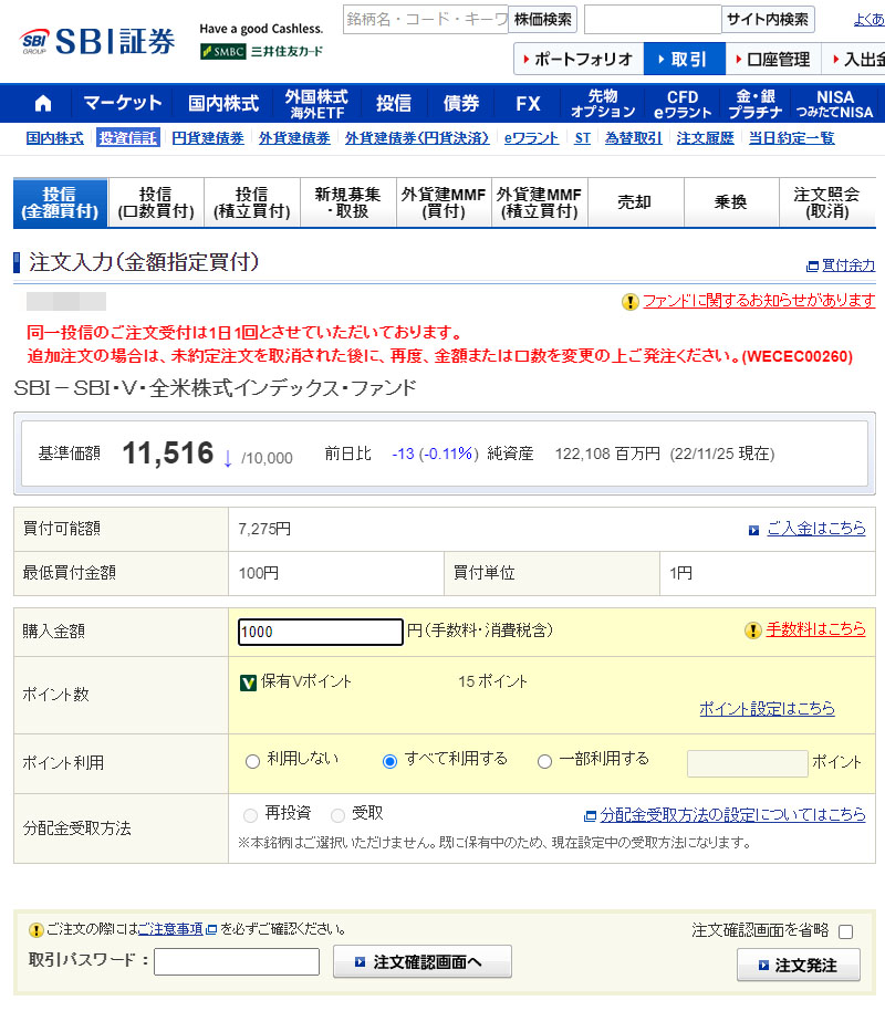 2日連続で「SBI・V・全米株式インデックスファンド」を注文しようとしたら
