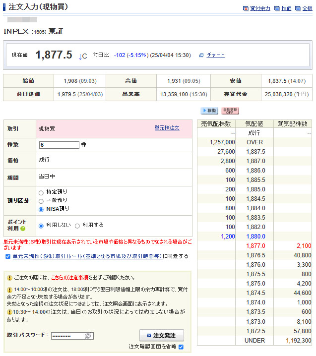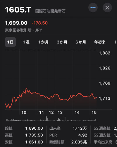 折角の暴落ですのでもう少し買いを入れようと思います。銘柄で悩みましたがこちらも5%近く下げていた「INPEX」にしました。理由は単純に利回りが良いのと切りのいい20株にしようと思っただけで深い考えはありませんwww
