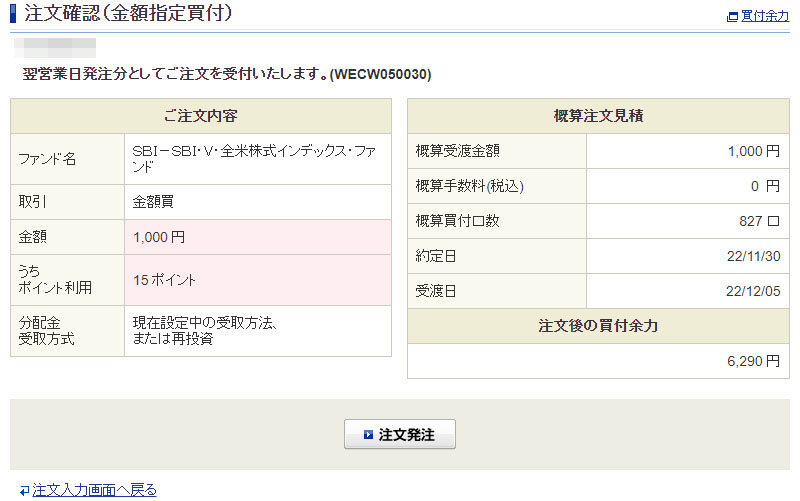 Vポイントが入ったのでSBI・V・全米株式インデックスファンドを1,000円分追加|2022.11.28 コメントを残す そういう訳で今日仕切り直しです。 Vポイント15ポイント分をすべて利用します。 今回も1,000円分で手元からの持ち出しは985円。 受付完了! 密かにこの「SBI・V・全米株式インデックスファンド」は期待してまして 今後も少額づつ・・・時には大胆にwww 来年は個別株、ETFは一切買わずにこちらに絞ろうかともw 厚切りジェイソンに習ってねwwwwwwwwww