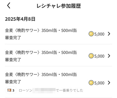 こちらが3回まで応募でき、1回に5,000コインで複数同時(同じレシートでの)応募が可能なレシチャレです。コスパもタイパも良く、前回の「金麦サワー」が割と美味しかったので500mlを3本買って一気に応募しました。