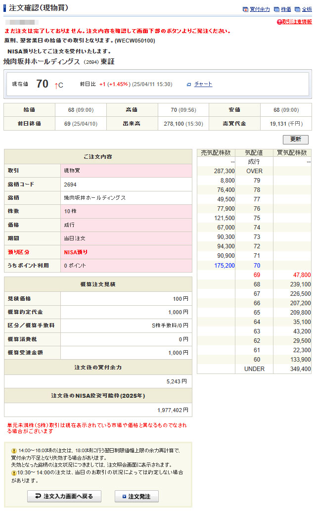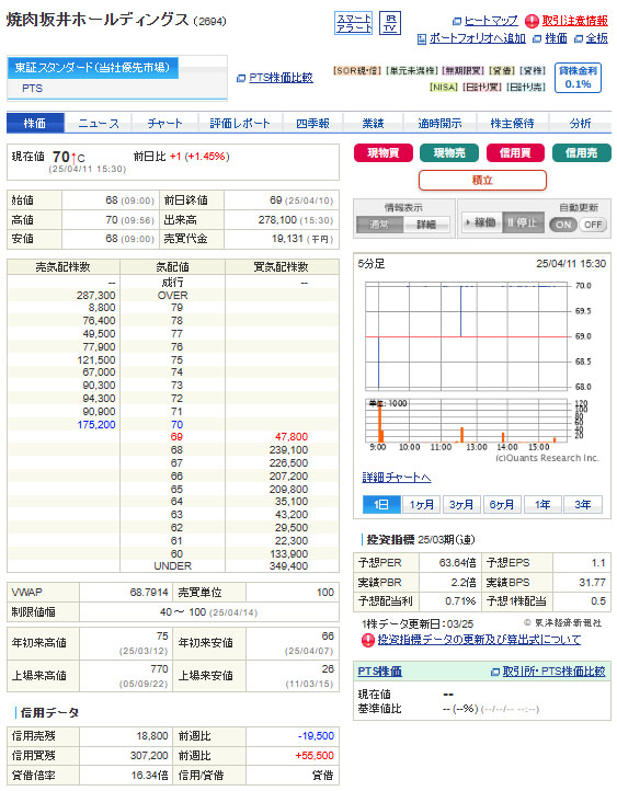 「焼肉坂井ホールディングス」は1日の売買数も少なく値動きは比較的マイルドのようです。