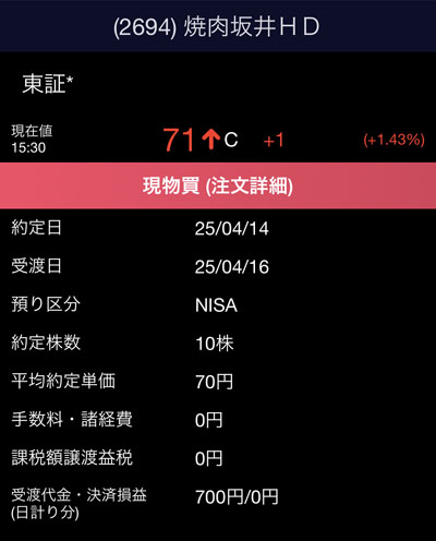 はじめての購入なので10株の保有で平均取得単価は70円です。