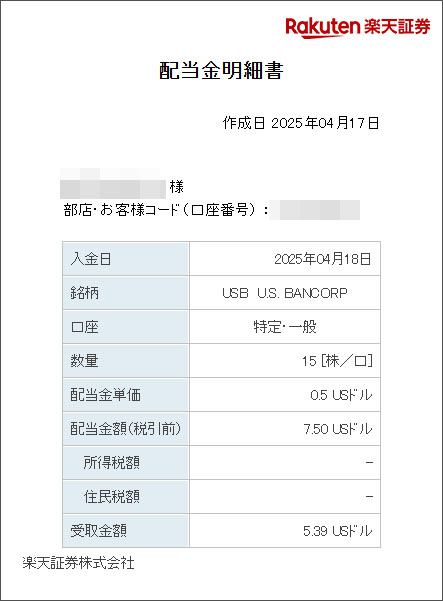 USバンコープ(USB)の配当が楽天証券口座に入りました|2025.4.17 米国の高配当銘柄「USバンコープ」から4月の配当が入りました。 =========(以下、コピペw)========= 15株保有 $0.50×15株=$7.50 $7.5×0.9=$6.75 $6.75×0.79685=$5.378・・・で、今回も$5.39でした。 ===============================