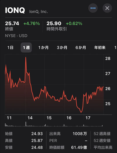 イオンキュー(IONQ)|2025年4月第3週|$25.74 今週はやや下げたものの値動きも小さくボックス相場でした。 あれほどボラが激しかったのにここ1ヶ月ほどは幅$4ぐらいで推移。 良くも悪くもこのあたりがこの会社の実情での価値なのかもしれない。 ・・・が、未来において爆上げしないとは限らないw だから僅かながらもキープしているし期待もしている!