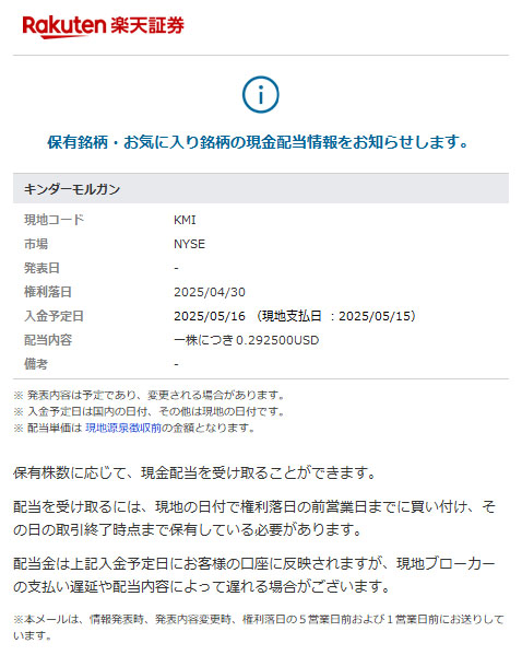 キンダー・モルガン(KMI)配当予告 2025.5 楽天証券から「キンダー・モルガン」5月分の配当予告メールが届きました。 現在20株の保有です。 配当金は少し増えて$0.2875から$0.2925に増配? $0.2925×20株=$5.85 $5.85×0.9=$5.265 $5.265×0.8≒$4.21・・・の予定です。