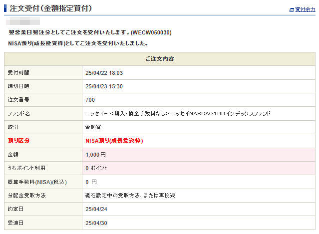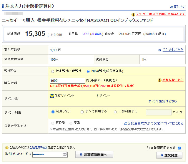 申請していたドットマネーの換金が口座に振り込まれたので「ニッセイNASDAQ100インデックスファンド」にそのまま入れます。