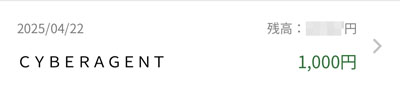 CYBERAGENTから楽天銀行口座へ1,000円の入金。