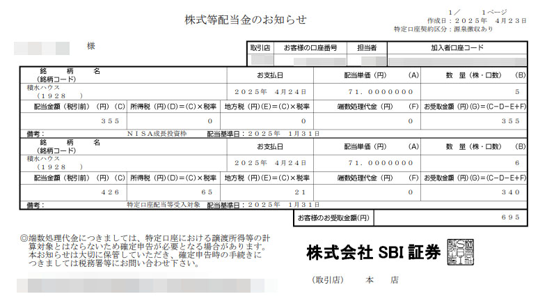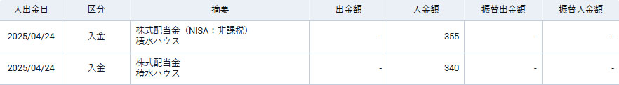 積水ハウスから配当がSBI証券口座に入りました。