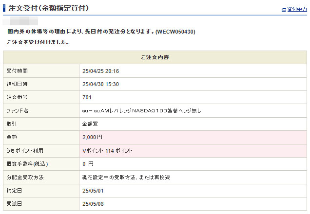 Vポイントが入ったので「auAMレバレッジNASDAQ100為替ヘッジ無し」へ2,000円分入金します。