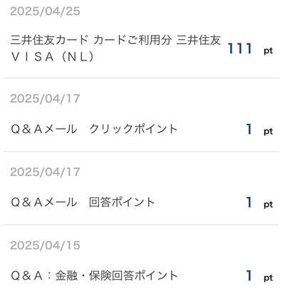 「三井住友カード カードご利用分 三井住友VISA(NL)」分の111ポイントとVポイント「Q&Aメール」の3ポイントで計114ポイントです。