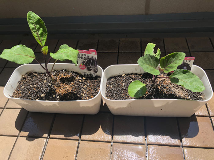 園芸野菜2025|ナス① 去年は結局収穫前に全滅でした。 理由は分からないが百均の化学肥料を入れたら調子が悪くなりそのまま・・・。 今年はプランター1つに苗1つにしました。もともと小さいので そして去年より1カ月早くスタート 左が「とげなし中長なす」、右が「泉州系水ナス」との事。 各217円(税別)近所のDCMホームセンターで購入しました。 今年は収穫まで行けるのか???