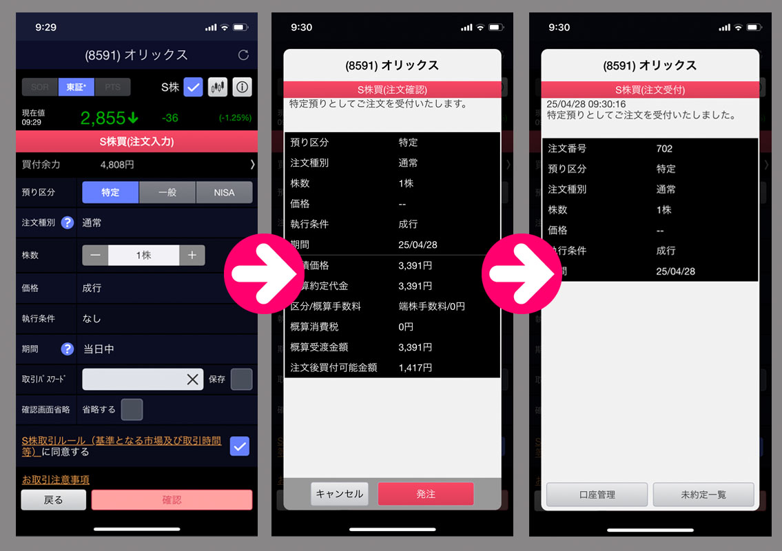 まだ朝なので午後の寄り向けでの株価で約定です。