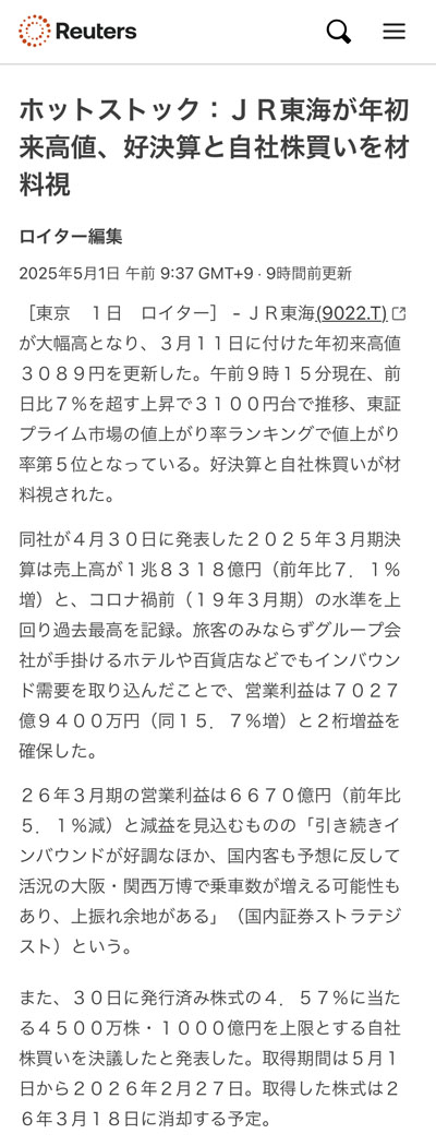 増配も31円が32円とまるで牛歩。。。リニアの問題(設備投資)もあるだろうししばらくは難しそうですがここ5年は1~2円毎年増配してますが財務的にはまだまだ余裕ありそうだしもう少し何とかならないかな~ 今日の高騰で配当利回りは0.99%・・・。